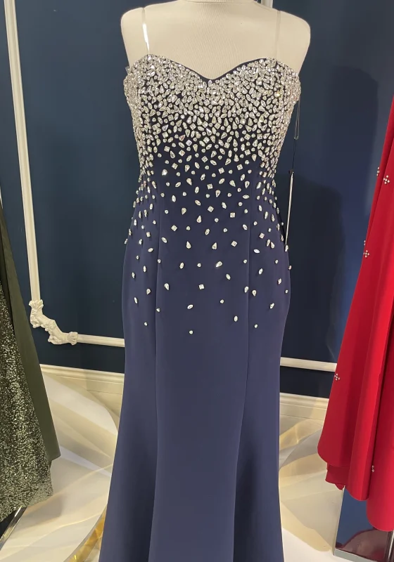 Zarif ve modern tasarımıyla öne çıkan bu lacivert abiye elbise, yoğun taş işlemeleri ve feminen kesimiyle özel davetlerde dikkat çekici bir stil sunar. Işıltılı kristal taş detaylarıyla tasarlanan üst bölümü ve vücuda oturan formu sayesinde hem şık hem de sofistike bir görünüm sağlar.