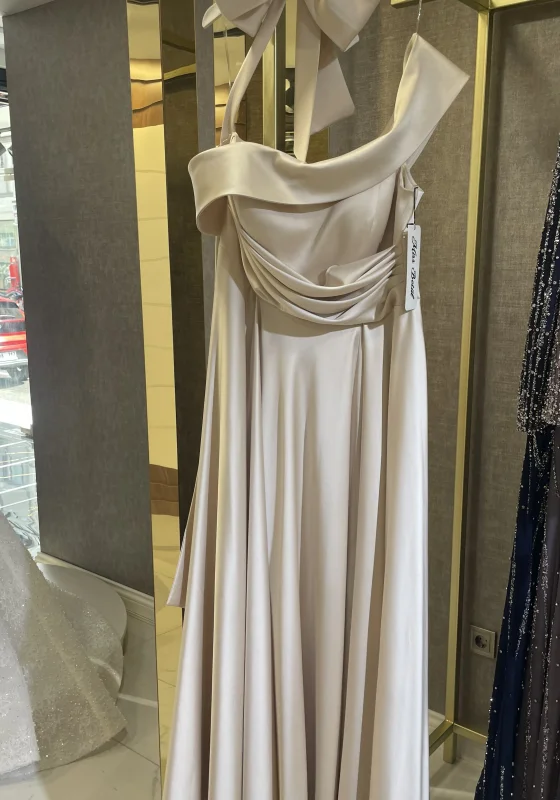 Zarif ve modern tasarımın kusursuz birleşimini sunan bu uzun abiye elbise, sade şıklığıyla özel davetlerde göz alıcı bir stil yaratmak isteyen kadınlar için tasarlanmıştır. Boyundan bağlanan halter yaka tasarımı ve büyük fiyonk detayı ile elbise, romantik ve sofistike bir görünüm sunar.
