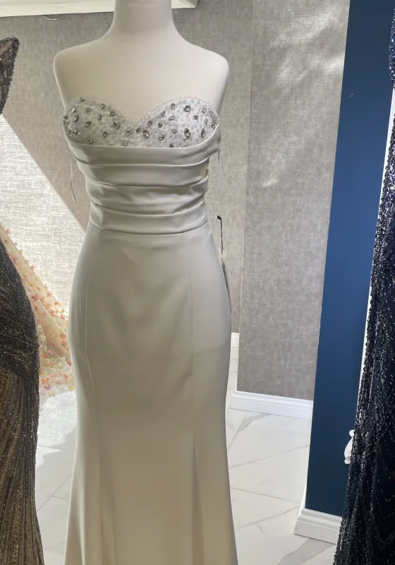 Ekru Taş İşlemeli Straplez Uzun Abiye Elbise