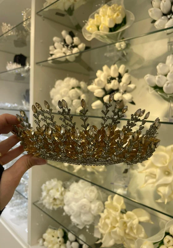 Özel günler, nişan, kına ve davetler için tasarlanmış şık ve dikkat çekici bir taç modelidir. Bal rengi ve şeffaf kristal taşların zarif dizilimiyle ışıltılı ve asil bir görünüm sunar. Hafif ve rahat yapısı sayesinde gün boyu konforlu kullanım sağlar, saç stilinizi zarif bir şekilde tamamlar.