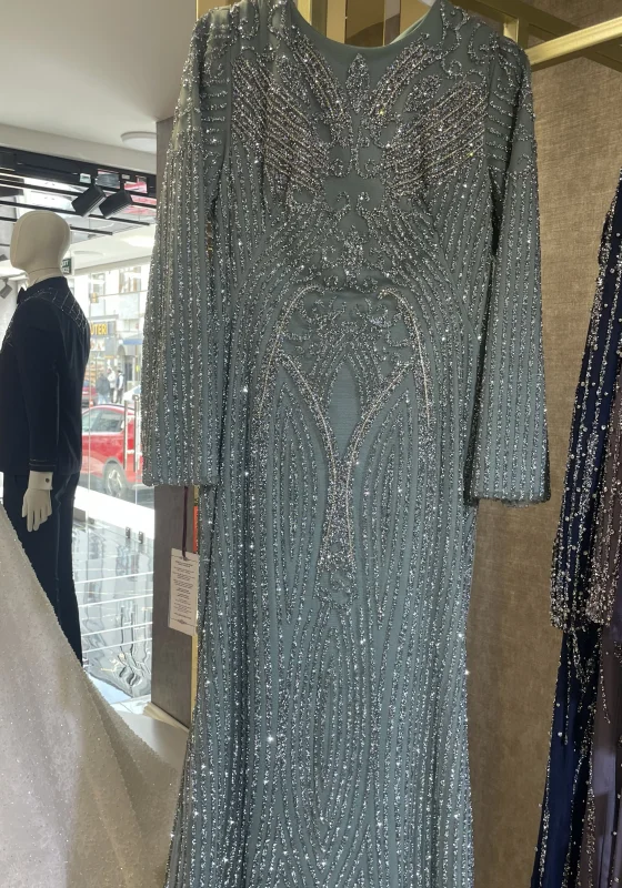 Detaylar: Tüm yüzeye yayılan yoğun taş işlemeleri, zarif kesim ve akıcı etek formu