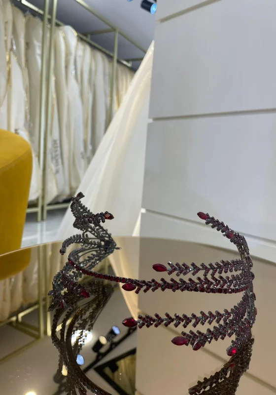 Bordo taş detayları ve zarif yaprak motifleriyle tasarlanan bu şık taç, özel günlerde sofistike bir görünüm sunar. İnce ve modern tasarımı sayesinde düğün, nişan, kına ve özel davetlerde saç stilinizi zarif bir şekilde tamamlayan göz alıcı bir aksesuardır. Işıltılı taşlarıyla şıklığınızı ön plana çıkarır.