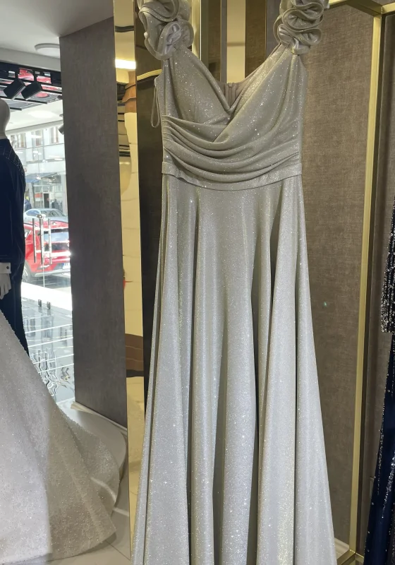Zarif tasarımı ve ışıltılı kumaşıyla dikkat çeken bu özel abiye elbise, davetlerde göz alıcı bir görünüm elde etmek isteyen kadınlar için tasarlanmıştır. Modern ve romantik detayların bir araya geldiği model, şıklığıyla özel günlerin vazgeçilmez parçalarından biri olmaya adaydır.