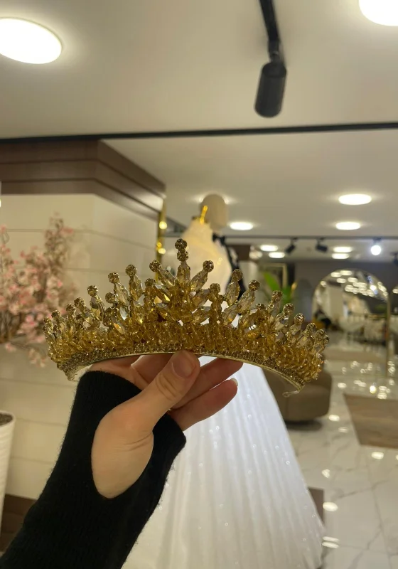 Altın tonlu kristal taşlarla tasarlanan bu zarif gelin tacı, göz alıcı ışıltısıyla özel günlerinize ihtişam katar. Şık ve gösterişli tasarımıyla gelinliğinizi kusursuz şekilde tamamlayan özel bir saç aksesuarıdır.