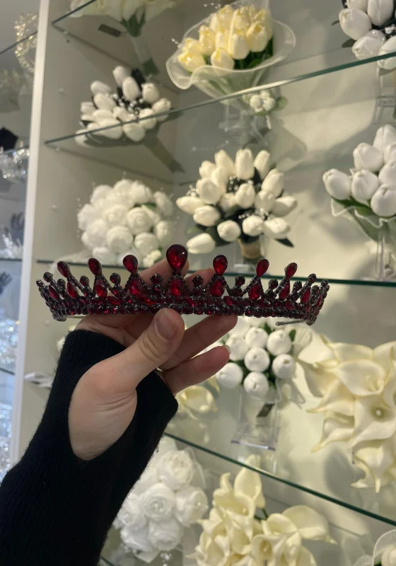 Parlak kırmızı taş detaylarıyla tasarlanan bu zarif gelin tacı, sade ve şık görünümüyle özel gününüze etkileyici bir dokunuş katar. Işıltılı taşları sayesinde saç modelinizi ön plana çıkarırken, kına, nişan ve düğün kombinlerinizi tamamlayan göz alıcı bir aksesuardır. Zarafeti ve şıklığı bir arada sunan özel bir tasarım.