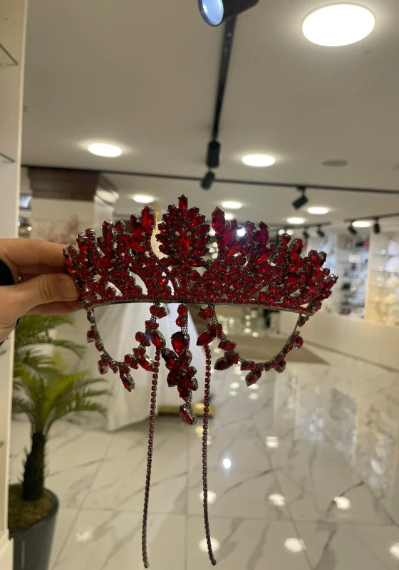 Kırmızı kristal taşlarla süslenen bu gösterişli taç, özel günlerde şıklığınızı ön plana çıkarır. Zarif sarkıt detayları ve ışıltılı tasarımı sayesinde kına, nişan, düğün ve özel davetlerde dikkat çekici bir görünüm sunar. Saçınıza kolayca uyum sağlayan bu aksesuar, şıklığınızı tamamlayan özel bir parçadır.