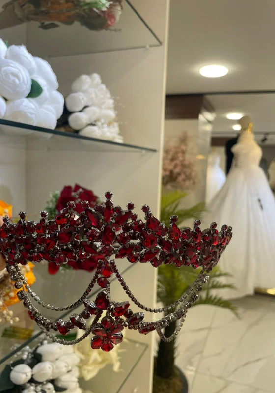 Kırmızı kristal taş detayları ve zarif zincir süslemeleriyle tasarlanan bu gösterişli gelin tacı, güçlü ve etkileyici bir stil sunar. Işıltılı yapısıyla özel günlerde dikkat çekici ve asil bir görünüm sağlar.