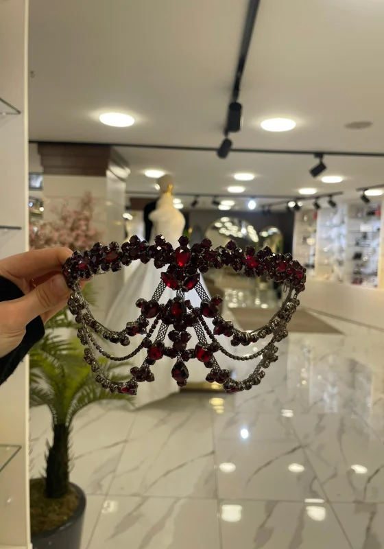 Derin kırmızı kristal taşlar ve zarif zincir detaylarıyla tasarlanan bu gösterişli taç, dikkat çekici ve şık bir görünüm sunar. Işıltılı taş yapısı sayesinde özel günlerde stilinizi ön plana çıkarır. Kına, nişan ve özel davetler için ideal bir aksesuardır.
