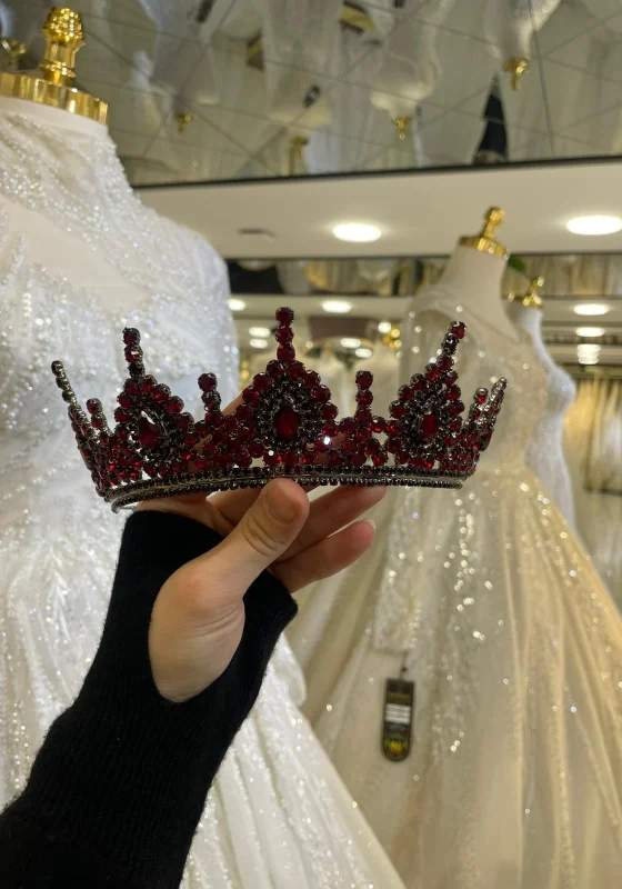 Kırmızı kristal taş detaylarıyla tasarlanan bu gösterişli gelin tacı, güçlü ve zarif bir görünüm sunar. Işıltılı taş dizilimi sayesinde düğün, nişan ve özel günlerde dikkat çekici bir stil tamamlayıcısıdır.