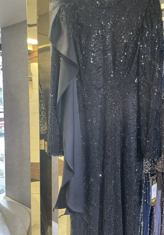 Elbisenin tamamında yer alan ince taş ve payet işlemeleri, elbiseye ışıltılı ve sofistike bir görünüm kazandırır. Siyah rengin asil duruşu ile birleşen bu detaylar, özel gecelerde dikkat çekici bir stil oluşturur.