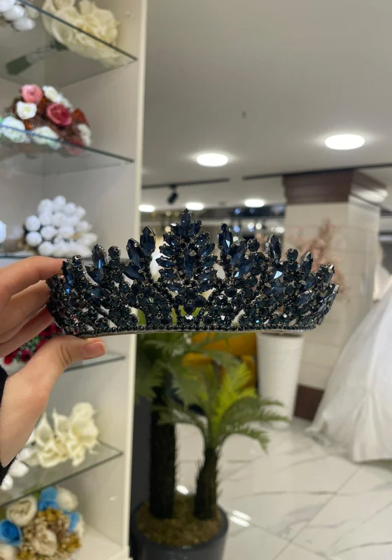 Modern ve güçlü bir görünüm arayan gelinler için tasarlanan bu özel gelin tacı, zarif kristal taş detaylarıyla dikkat çeker. Yoğun taş işlemeli yaprak formundaki tasarımı sayesinde saç modeline hacim ve ışıltı katar. Klasik gelin tacı modellerinden farklı olarak siyah taş kullanımıyla sofistike ve iddialı bir stil oluşturur.