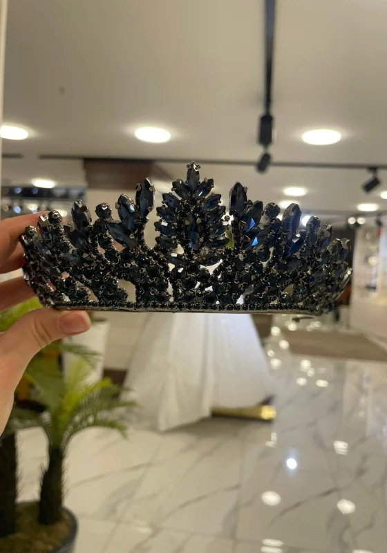 lacivert kristal taşlarla tasarlanan bu şık gelin tacı, modern ve etkileyici bir görünüm sunar. Işıltılı taş detayları sayesinde düğün, nişan ve özel davetlerde saç stilinizi tamamlayan güçlü ve zarif bir aksesuardır.