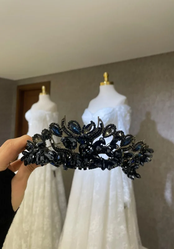 lacivert taş detayları ve zarif çiçek motifleriyle tasarlanan bu şık gelin tacı, modern ve etkileyici bir görünüm sunar. Işıltılı kristal taşları sayesinde özel günlerde saç stilinizi tamamlayan dikkat çekici bir aksesuardır. Düğün, nişan ve özel davetler için ideal bir seçimdir.
