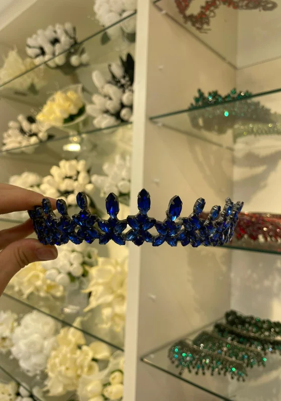 Işıltılı lacivert taşlarla süslenmiş bu zarif taç, özel günlerinizde şıklığınızı tamamlayan göz a... Devamı