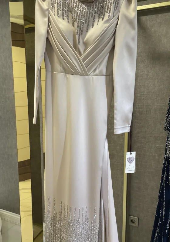 Zarif detayları ve modern tasarımıyla dikkat çeken bu abiye elbise, özel davetlerde şıklığıyla fark yaratmak isteyen kadınlar için tasarlanmıştır. Yüksek yaka formu, ışıltılı taş işlemeleri ve akıcı kumaşı sayesinde hem sofistike hem de göz alıcı bir görünüm sunar.