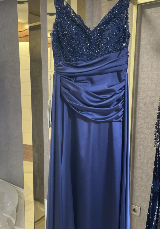 Zarif tasarımı ve sofistike detaylarıyla öne çıkan bu abiye elbise, özel davetlerde şıklığıyla fark yaratmak isteyen kadınlar için tasarlanmıştır. Üst kısmındaki yoğun taş işlemeleri ve etek bölümündeki drape detayları sayesinde hem modern hem de zarif bir görünüm sunar.