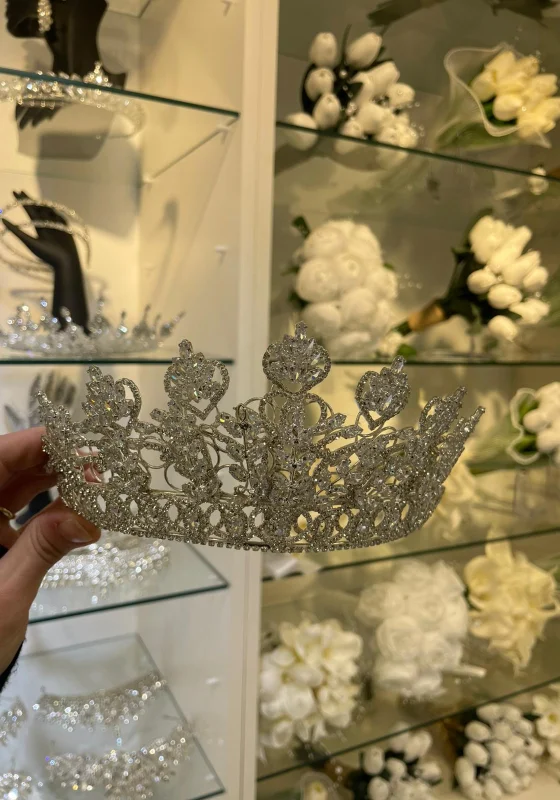 Parlak kristal taşlarla süslenmiş bu gösterişli gümüş taç, zarif ve ihtişamlı tasarımıyla özel günlerinizde dikkat çekici bir görünüm sunar. Detaylı taş işçiliği ve dayanıklı metal yapısı sayesinde hem şık hem de konforlu bir kullanım sağlar. Düğün, nişan, kına ve özel davetler için mükemmel bir aksesuardır.